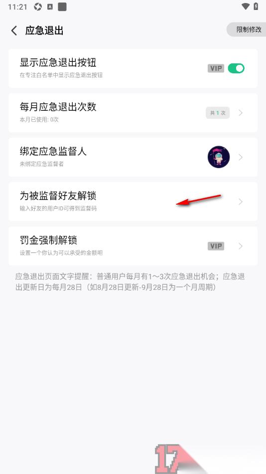 5.除此之外用户还可以根据需求设置为被监督好友解锁、罚金强制解锁、显示应急退出按钮等相关功能,如图所示。