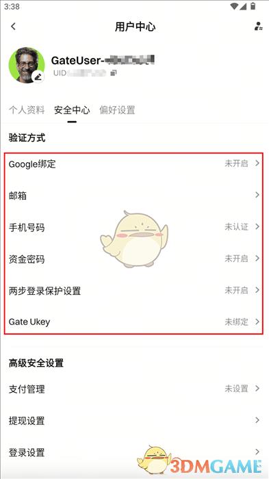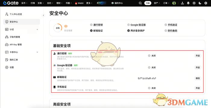 注册完成后,点击页面左上角的头像,点击进入用户中心,切换到【安全中心】tab。