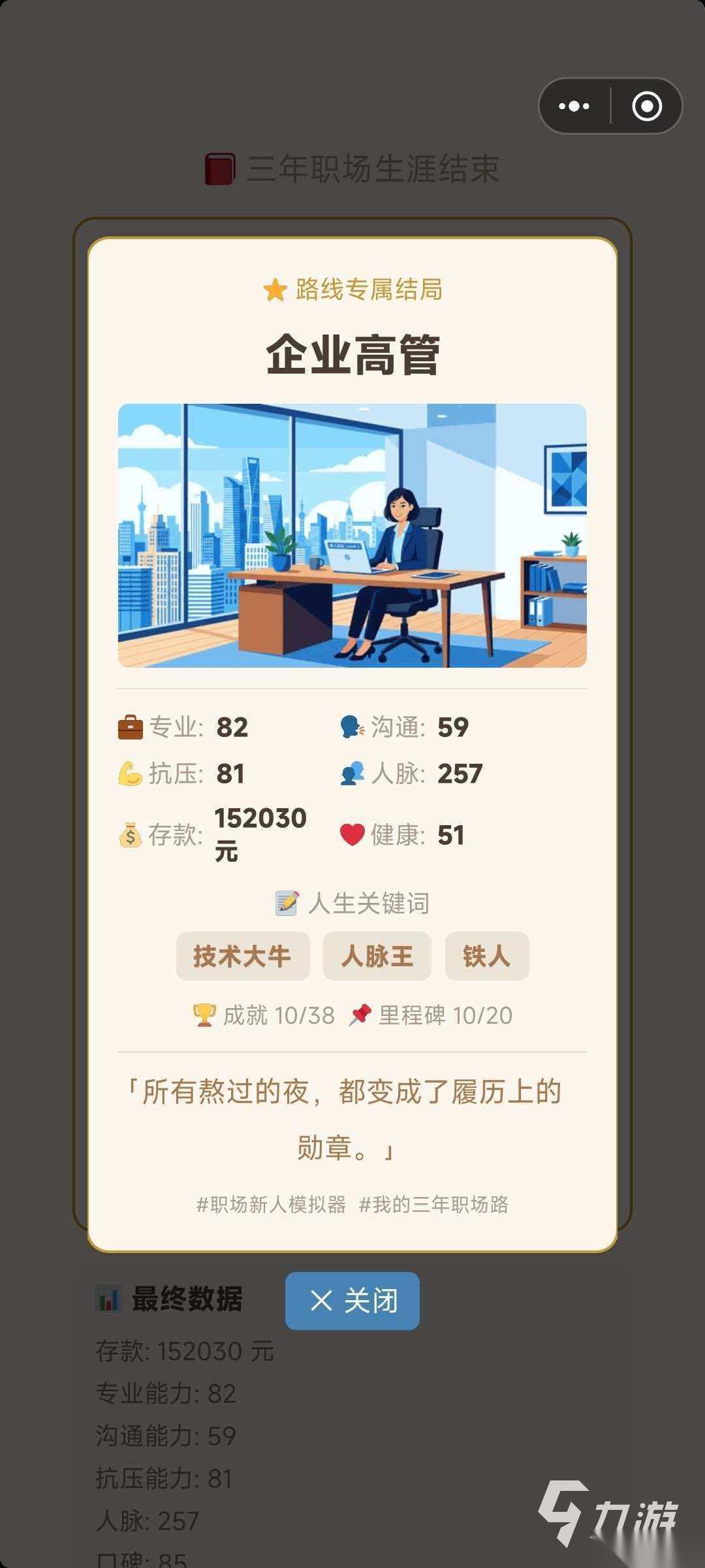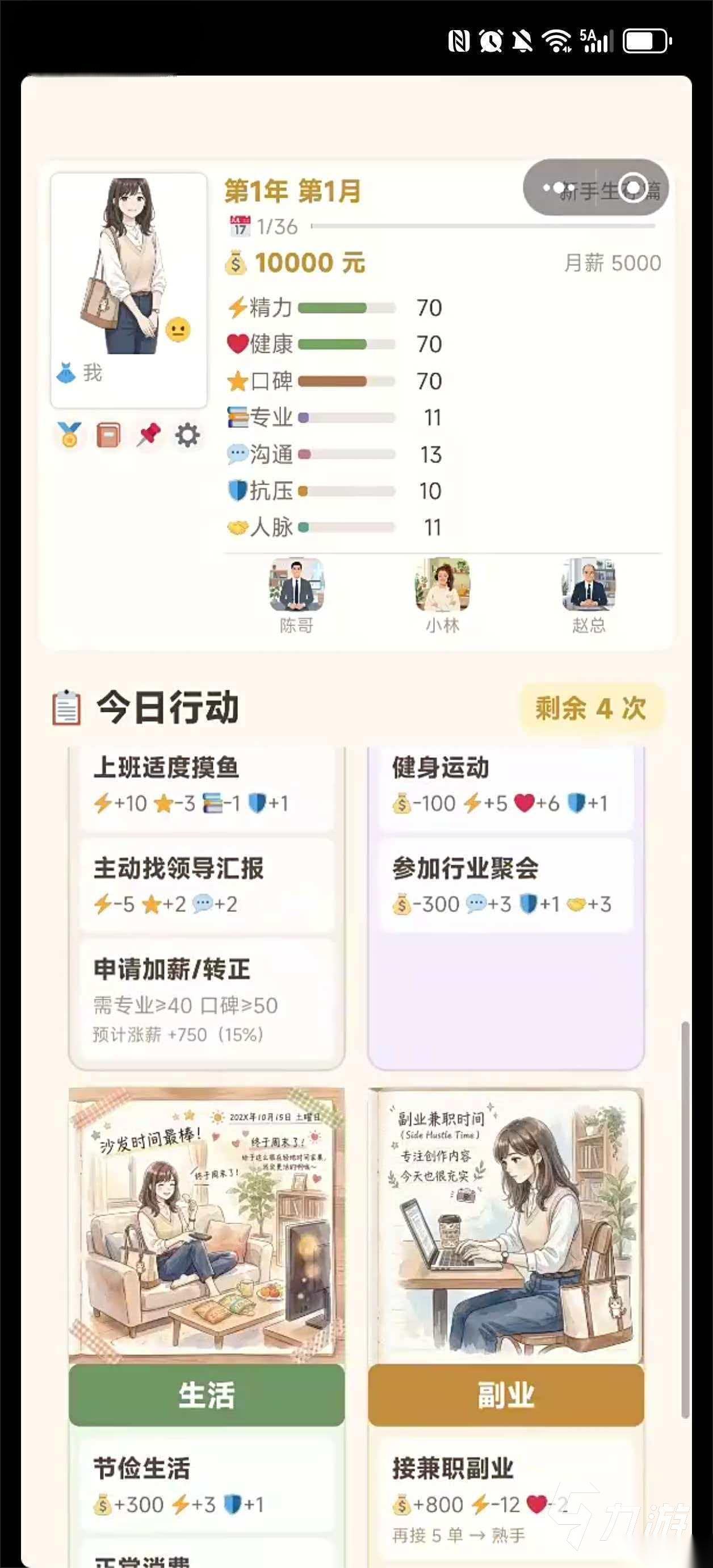 大家可以开始每天的选择,在进行选择的时候会触发各种事件,大家需要保住自己的精力和健康,同时还要保住自己的钱包,只有这样大家才能收获更高的福利,并且还能在职场中获取晋升。