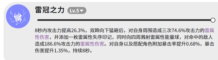 技能方面,先说雷冠之力。这个技能在5级的时候,能让攻击力在8秒内提升26.3%,然后双蹄砸地,对周围打出三次伤害,每次是74.6%攻击力的雷属性伤害,还会附上一枚雷属性失序印记。砸完之后,还会往四周弹出雷属性能量球,打中敌人的话,能造成186.6%攻击力的雷属性伤害。