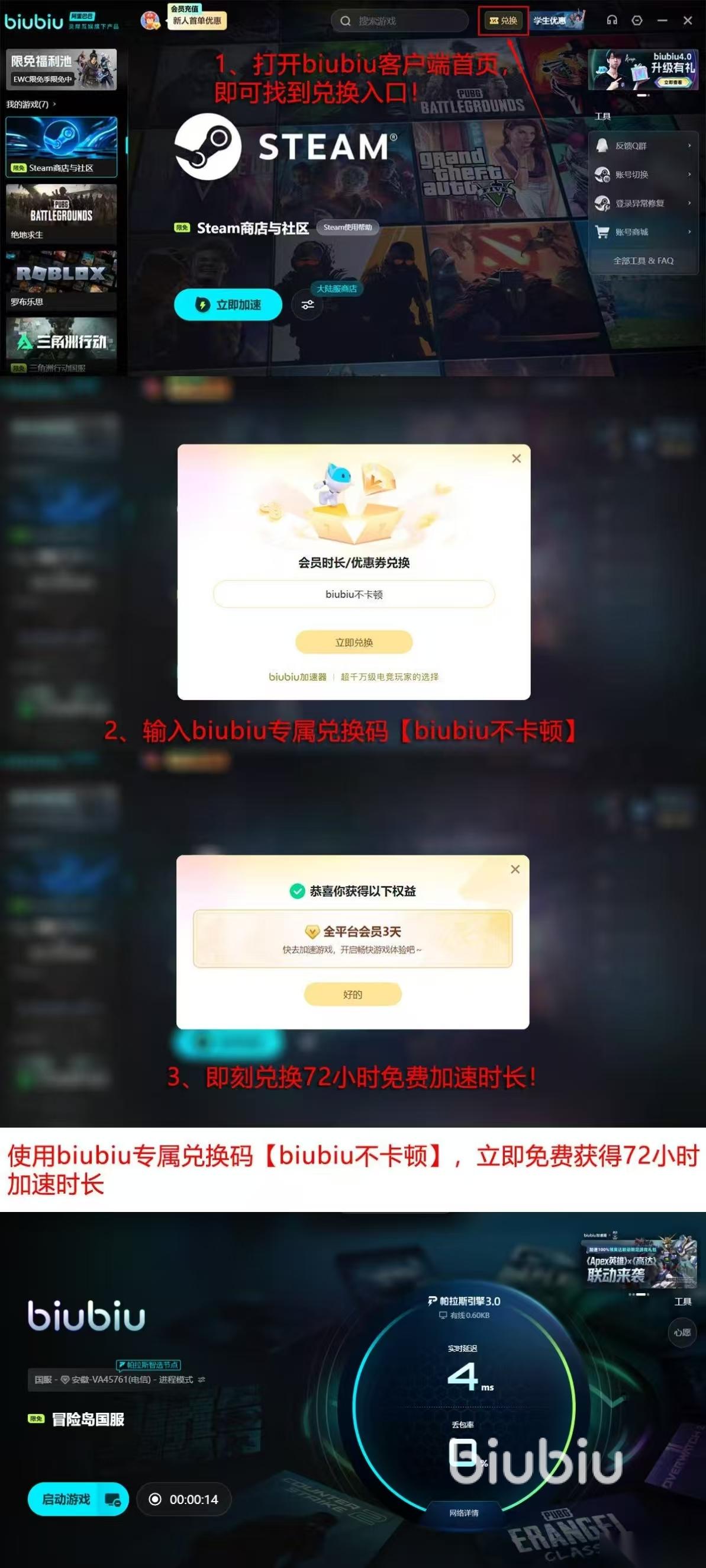 如果注册成biubiu加速器新用户,可以得到24小时免费试用。另外输入兑换码【biubiu不卡顿】可以得到72小时的加速时间,一共96小时。超值福利可以让你在测试游戏的稳定性能的时候,得到biubiu加速器强大功能的全方位体验,感受到飞跃式的体验提升。无论是和小伙伴一起去探险,在其它网络游戏中与朋友展开激烈竞争,biubiu加速器都能为用户给予全方位的优化服务。