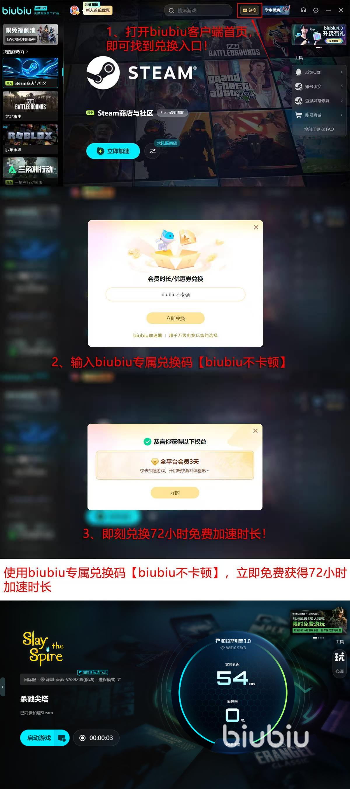 目前新用户完成注册立即可获得24小时全功能免费试用权,输入【biubiu不卡顿】,即可额外再领取72小时的免费加速时长,两项福利叠加,总计可畅享长达整整4天的顶级加速服务,零成本投入,亲身验证告别卡顿的非凡体验。
