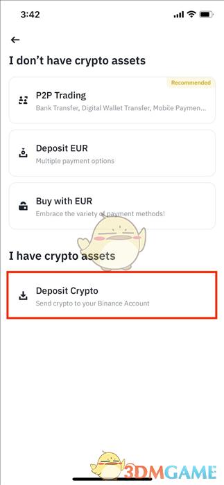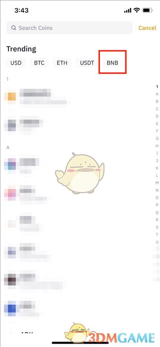3.选择要充值的加密货币,以BNB为例。