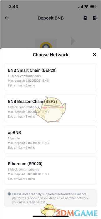 4.系统将显示可用于充值BNB的网络。请谨慎选择充值网络,确保所选网络与提现平台的网络一致。如果选错网络,资金可能会丢失,无法找回。