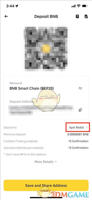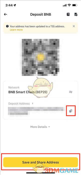5.系统将显示所选网络的二维码和充值地址。点击复制图标复制充值地址,并粘贴至提现平台的地址字段。您也可以点击【保存并分享地址】保存二维码并在提现平台直接导入。