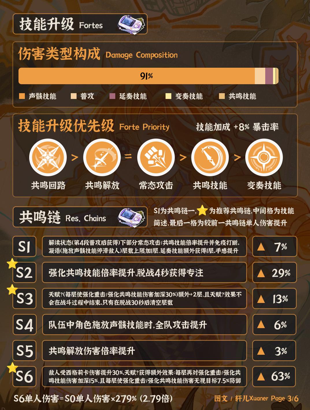 ③ 西格莉卡主要输出类型为声骸技能伤害。共鸣链推荐抽取2/6链。1链提升手感,2链提升伤害倍率,3链Buff额外加两层且战斗不清空,6链伤害大幅提升。总的来说低链西格莉卡搭配仇远性价比就很高了,如果是厨子,可以追求高链。
