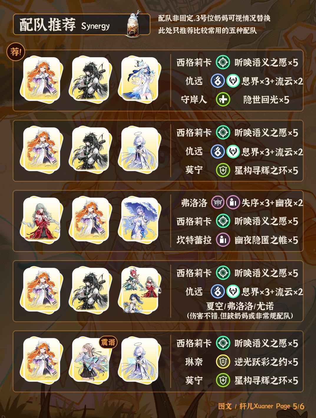 ⑤ 西格莉卡是声骸主C。从配队角度来看比较刚需仇远,与其他角色搭配效果一般,所以尽量西格莉卡要和仇远一起抽取。西仇的伤害也非常高,低链投资不亏。理论西仇+夏空伤害最高,但没有奶妈,西仇守是最好的搭配,守岸人换其他奶妈也可以,伤害低一点。实在不抽仇远的话最好进弗洛洛队,与夏空、琳莫也有搭配的可能,但伤害会差很多。