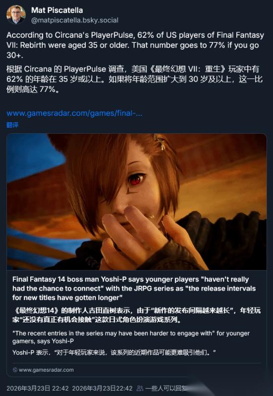 据数据调研机构Circana高级总监Mat Piscatella分享,“在美国,《最终幻想7:重生》的玩家中有62%年龄在35岁及以上;如果把范围扩大到30岁及以上,这一比例则高达77%。”