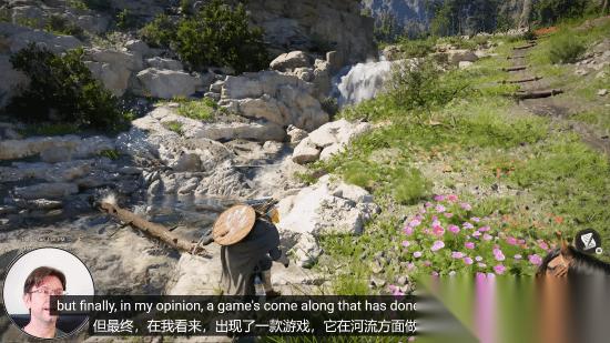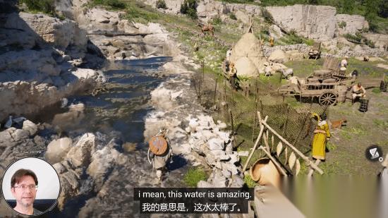 但尽管如此,他依然对游戏水体的物理与渲染效果大加赞赏,甚至直言,在这一点上,《红色沙漠》做得比《荒野大镖客:救赎2》更好。不仅呈现出了真实的河流效果,还通过对波浪的实时模拟,水体显得更加动态且具有互动性(下图中植被重新着色过,因为David O'Reilly认为原版太过艳绿)。