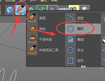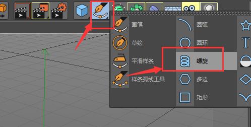 1、如图,打开C4D后,找到钢笔图标该工具下的螺旋选项