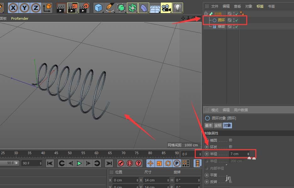 6、这时候选中圆环的图层,调整下面属性中的半径数值,将其调小,这时候,左侧的图就变成了一个实体感的螺旋弹簧效果了
