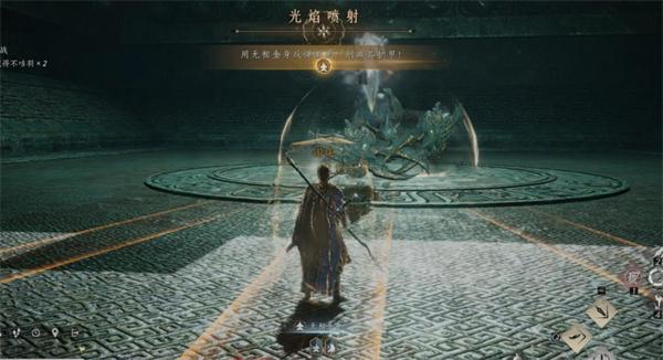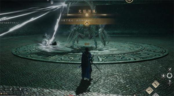 7、绝对压制,光焰领域释放完毕后会释放该技能,建议确保内场为安全区,然后前往指定地点卸势进入拼刀状态,只有一人可进入该状态,进入后通过QTE可直接对首领造成伤害,其余玩家可全力输出首领快速破盾,可使首领瘫痪。