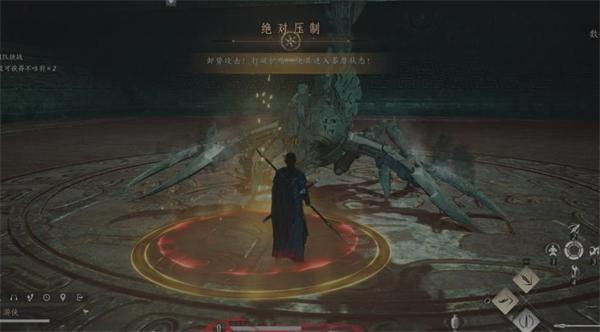 4、角力,BOSS护甲值清空后会释放该技能,会高举双臂准备下砸,可以前往指定区域卸势,至少需要一人卸势到,卸成功直接进入qte,没有卸势到的游侠可通过走到首领面前交互加入,QTE成功则可使首领瘫疾,如若失败首领将恢复满值护甲值。