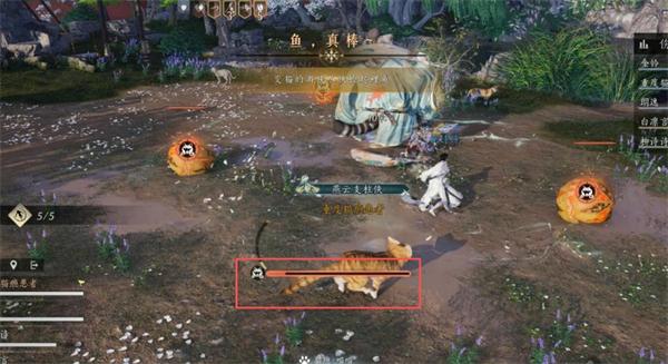 6、鱼真棒,BOSS会扔出一个锦鲤和三个藤球,并且选择一位玩家进入化猫状态,进入化猫状态的游侠尽快躲开藤球并捡起锦鲤,随后对御猫大王释放锦鲤旋风,被猫卫选中的游侠将猫卫吸引到藤球附近。