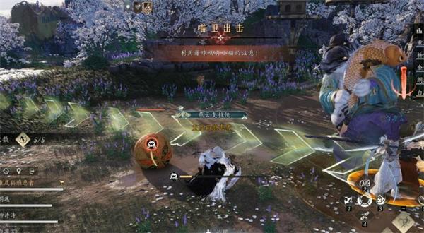 4、喵卫冲锋,BOSS会指挥周边的猫卫冲向玩家,可卸势打断冲锋,被击中会增加猫瘾。注意躲避,或卸势打断猫卫冲锋,控制自身的猫瘾。