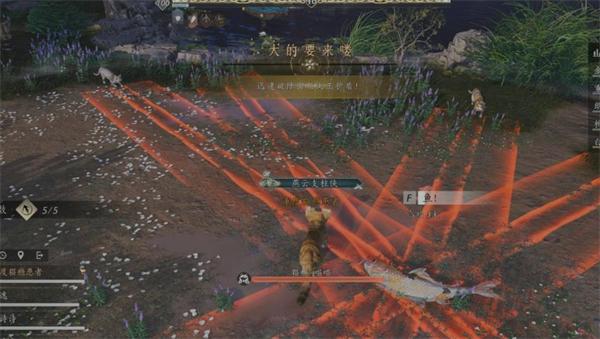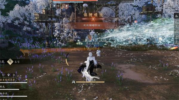 7、锦鲤喷流,BOSS蓄力一段时间后,利用手中锦鲤喷出的水流扫过全场,建议跳开或者躲在BOSS身后。