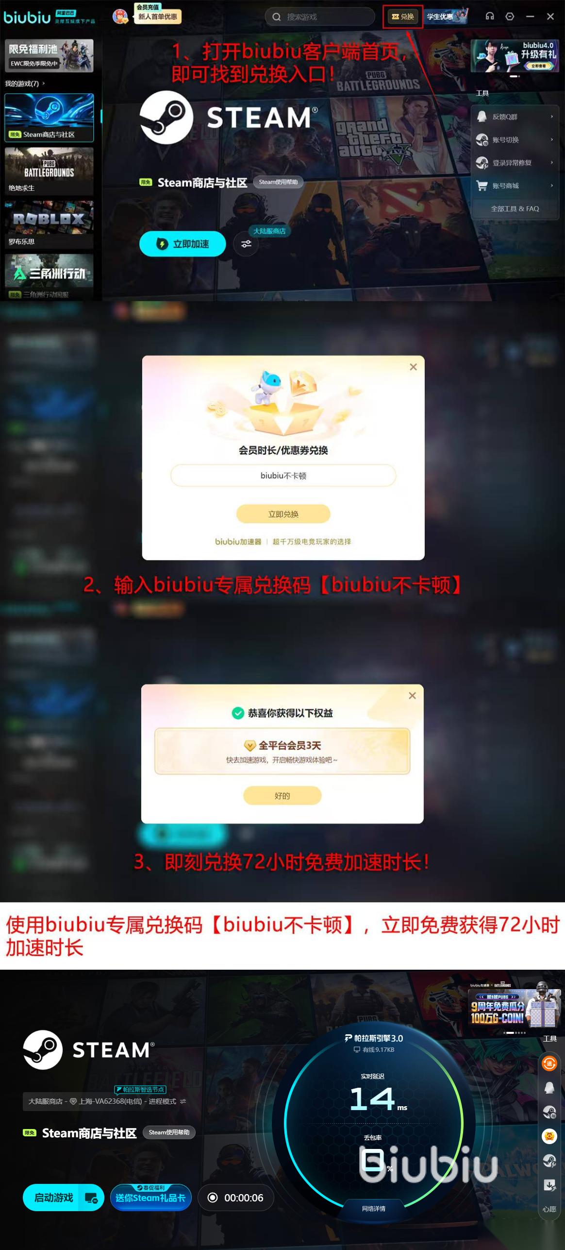 而且biubiu加速器的福利特别给力,新用户注册后不用花一分钱就能直接获得24小时的免费加速时长,足够大家尽情体验FIFA13,测试加速效果。除此之外,新老用户都能享受额外福利,只要在加速器内输入兑换码【biubiu不卡顿】,就能再领72小时的免费加速,相当于免费获得4天的优质加速服务。不管玩家是偶尔玩一玩呢还是长时间畅玩,都能满足游戏需求,真正做到零成本享受流畅游戏体验。