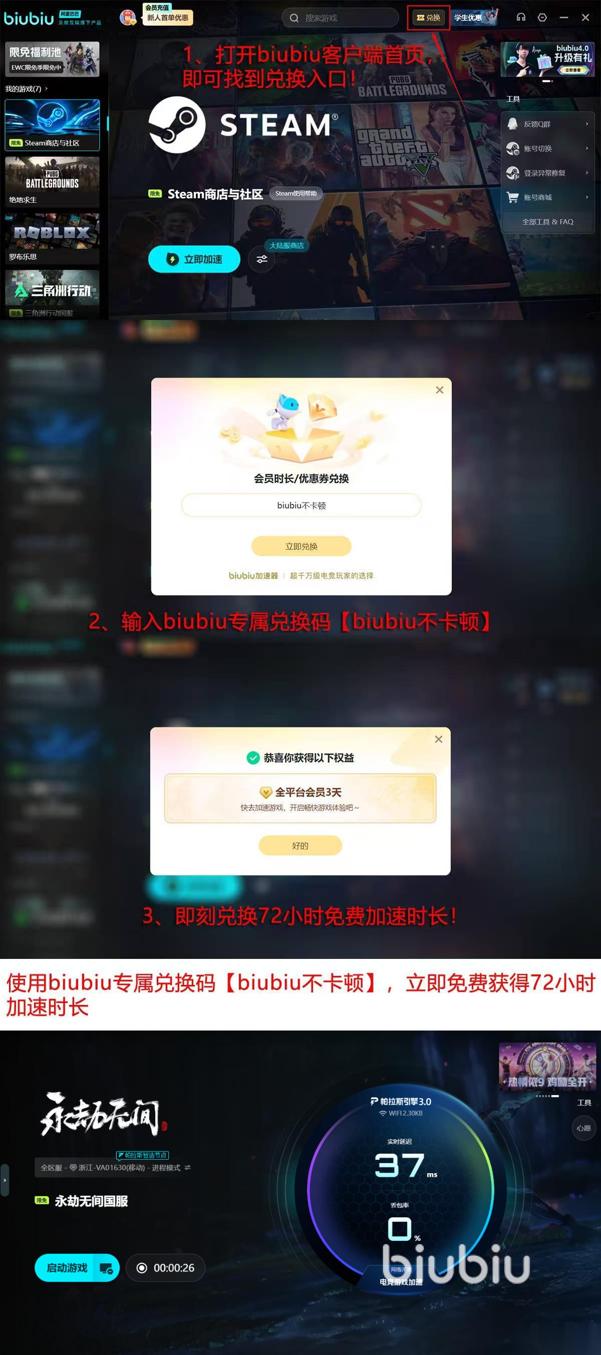 新用户注册即刻解锁24小时全功能免费加速,输入【biubiu不卡顿】再获72小时加成,共计96小时深度体验,用四天完整测试从日常匹配到巅峰对决的全场景表现。