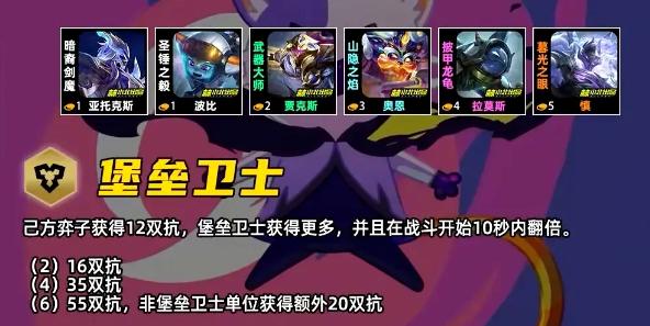 金铲铲之战S17堡垒卫士羁绊为全队提供双抗,堡垒棋子加成更高且前10秒效果翻倍。2/4/6羁绊分别提供16/35/55双抗,非堡垒英雄在6羁绊时额外获得20点。羁绊棋子包括剑魔、波比、贾克斯、奥恩、龙龟、慎。