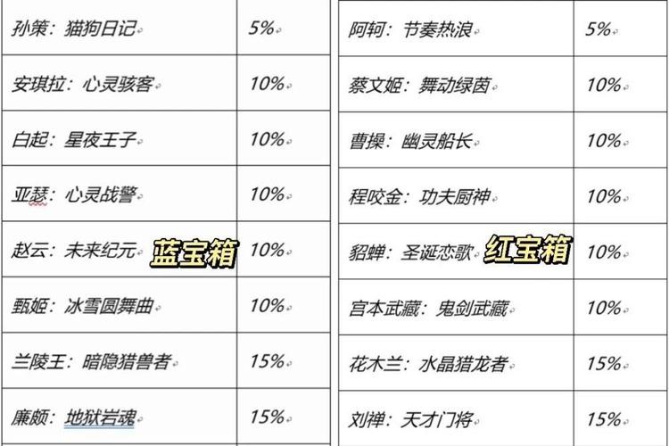 史诗皮肤宝箱(红),5%概率的有阿珂节奏热浪,10%概率的有程咬金功夫厨神、蔡文姬舞动绿茵、貂蝉圣诞恋歌、曹操幽灵船长、宫本武藏鬼剑武藏,15%概率的则有花木兰水晶猎龙者、刘禅天才门将、以及夏侯��乘风破浪。这里面最好的当然是阿珂的节奏热浪,从未上架过碎片商店,而且自身也推出了很多的星元部件;其次就是宫本武藏的鬼剑武藏,因为宫本重做的缘故,所以宫本所有的皮肤也随之翻新,鬼剑武藏这款皮肤也终于是有了史诗皮肤对应的特效;其他的皮肤就都是碎片商店的常客了,也没有比较大的优化翻新。