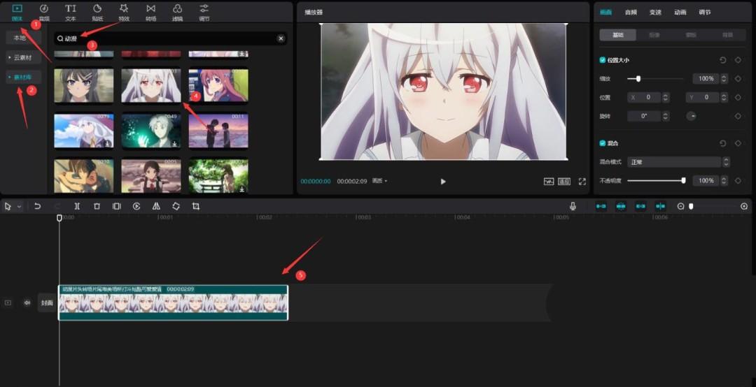 点击媒体按钮,然后点击素材库按钮,在搜索栏中输入动漫两字,选择一段视频,将其添加到视频轨道中,见下图。