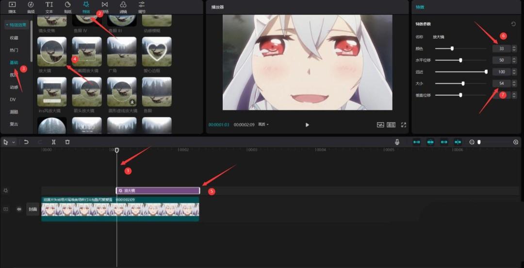 将时间轴移动到要变脸的位置,点击特效按钮,选择基础中的放大镜特效,将其添加到特效轨道中,更改颜色为33,大小为54,见下图。
