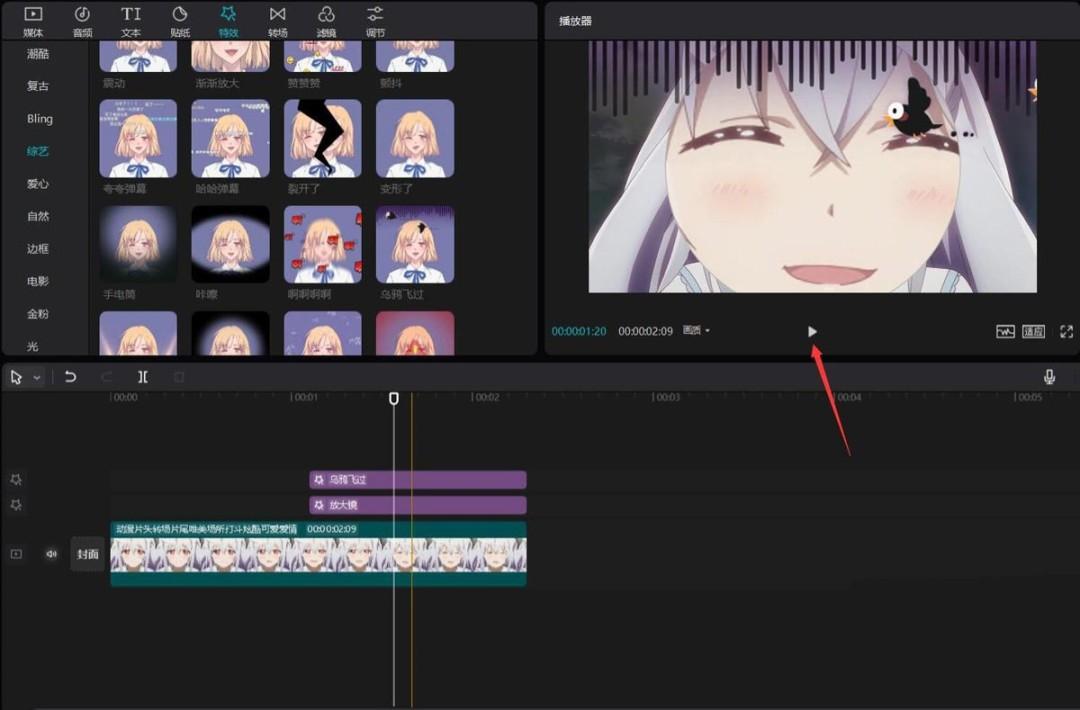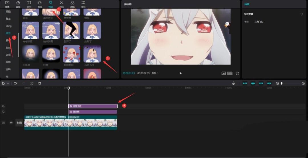 点击综艺按钮,选择乌鸦飞过特效,将其添加到特效轨道中,见下图。