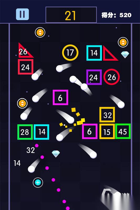本作玩法是经典的弹珠和数字消除的结合。游戏开始后,屏幕下方会有一个发射器,上方则是带着数字的方块阵。玩家的任务就是用有限的弹珠,在方块下落前将它们全部消除。首先要按住屏幕,然后水平拖动进行瞄准。找准时机松开手指即可发射弹珠。操作虽然简单,但不同的角度和力度都会对弹珠的发射产生影响,进而实现连锁反应。