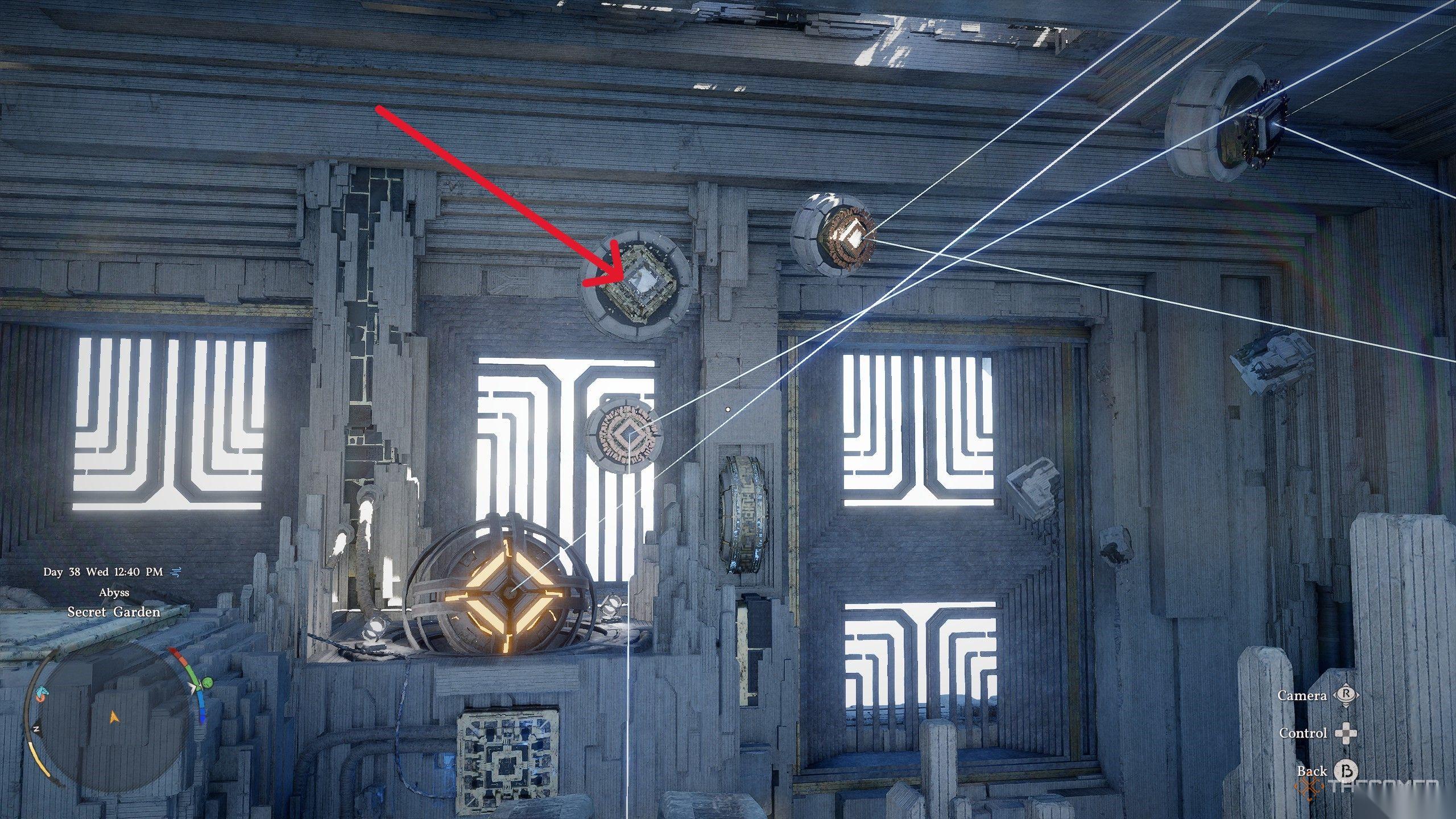 细胞放入插槽后,爬到正上方的大型激光炮后面。使用“公理之力”在炮身后部移动激光束。你需要将激光对准正对面另一台激光炮正上方的漂浮菱形镜。这会使激光束从你当前的炮台反射,在房间内绕行,最终落在另一束激光瞄准的同一块面板上。