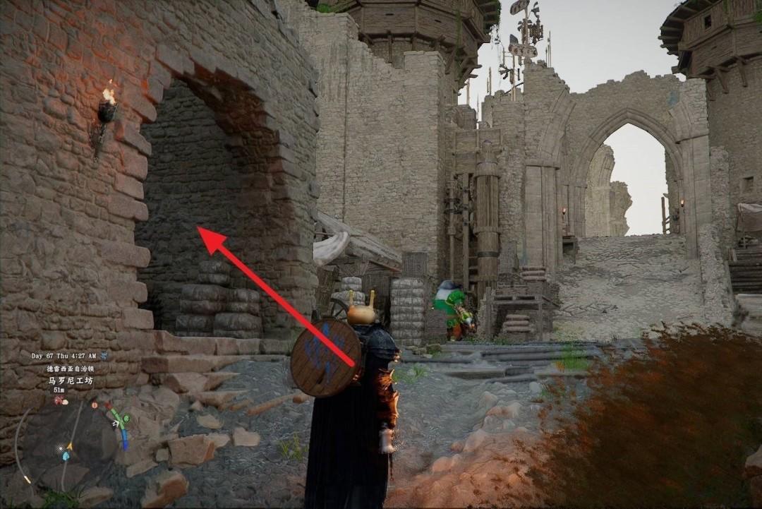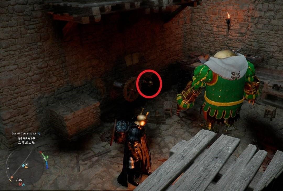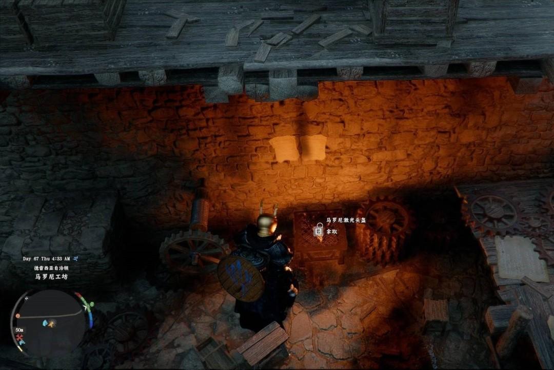 位于德雷西亚区域右下角的【马罗尼工坊】,按照地图上画出的路线从正门进入工坊,然后左转从墙上的破洞进入第一个房间,在房间里齿轮旁的箱子上,即可拾取马罗尼激光头盔。