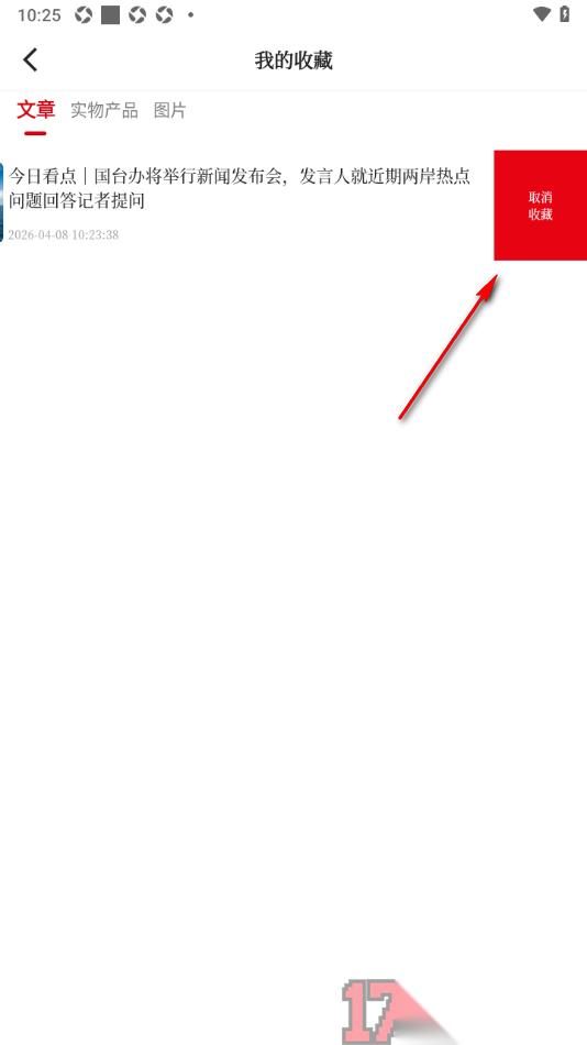 4.之后向左侧移动即可显示出一个【取消收藏】的功能,需要点击该按钮即可一键删除该收藏信息。