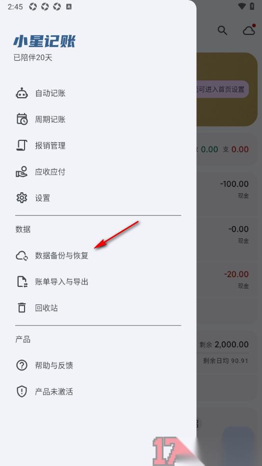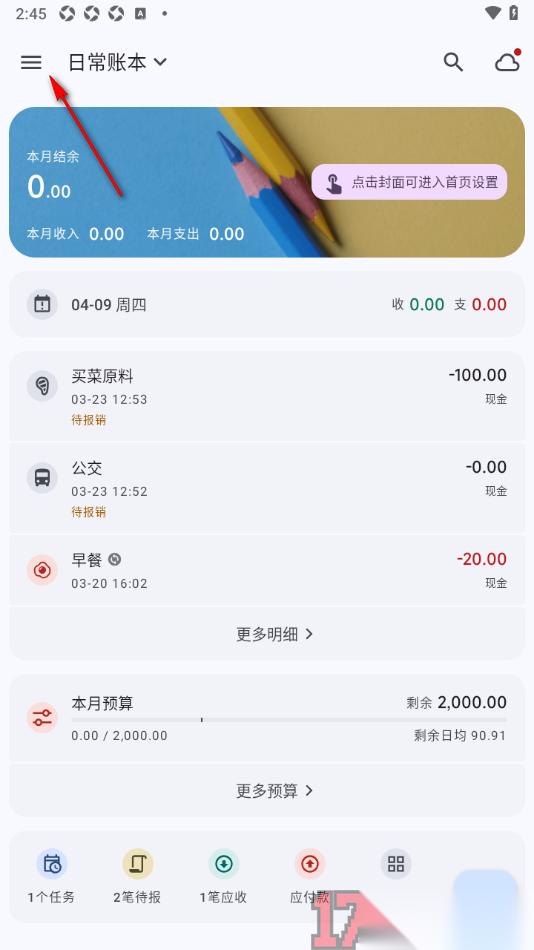 1.将安装到手机上的小星记账APP点击打开之后,在打开的页面上方将【三】图标按钮点击打开即可进入操作。