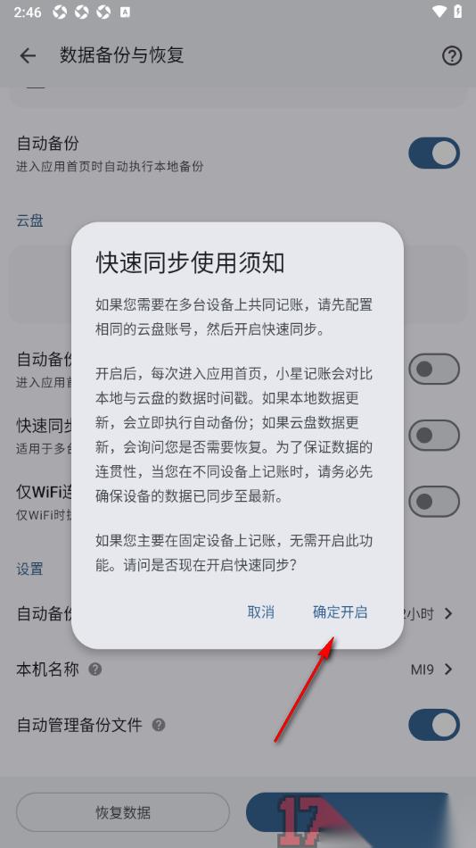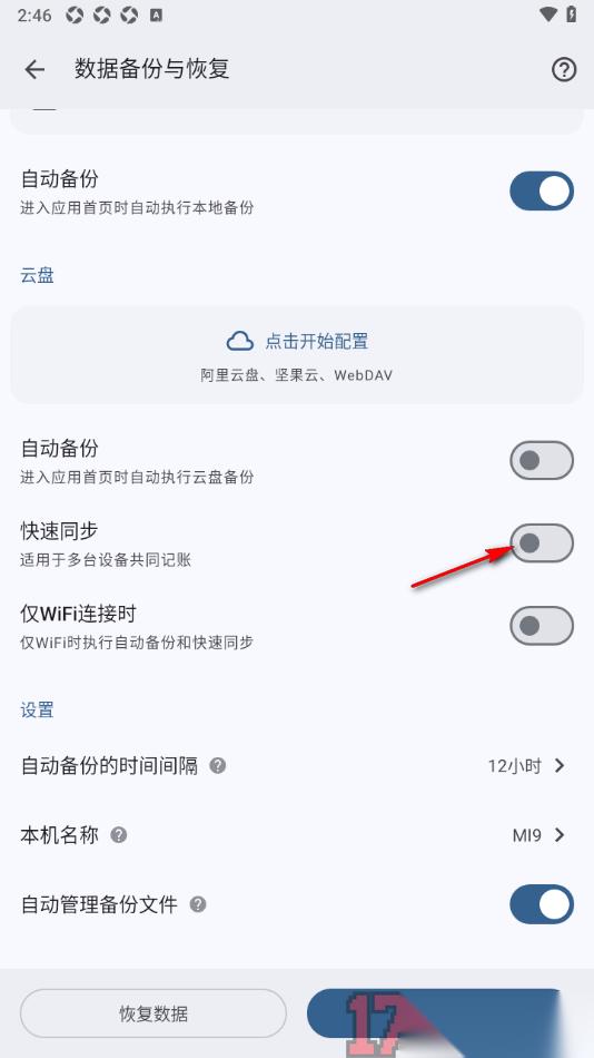 小星记账APP是一款小伙伴们平时会用来记录日常账单数据的应用软件,在该应用中用户可以设置报销账单、新建账本以及进行各类账单名称设置等,提供的功能内容非常丰富,若是长期使用这款软件并且总是切换不同的设备登录该应用账号记录内容,那么为了让记录的账单数据得到统一,可以开启快速同步功能,后期在不同的设备登录同一个账号时,会自动的同步曾经记录的账单数据,能够方便用户统一记账和对账等,直接进入到设置页面中找到快速同步功能点击开启即可,还可以设置自动备份等功能。