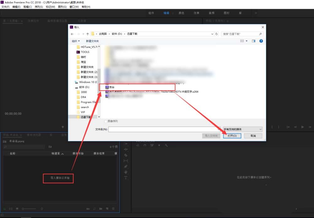 3、建好项目后,在左下角的媒体库模块中双击打开导入窗口,选择我们想要导入的视频,点击【打开】,就会自动导入进来了。
