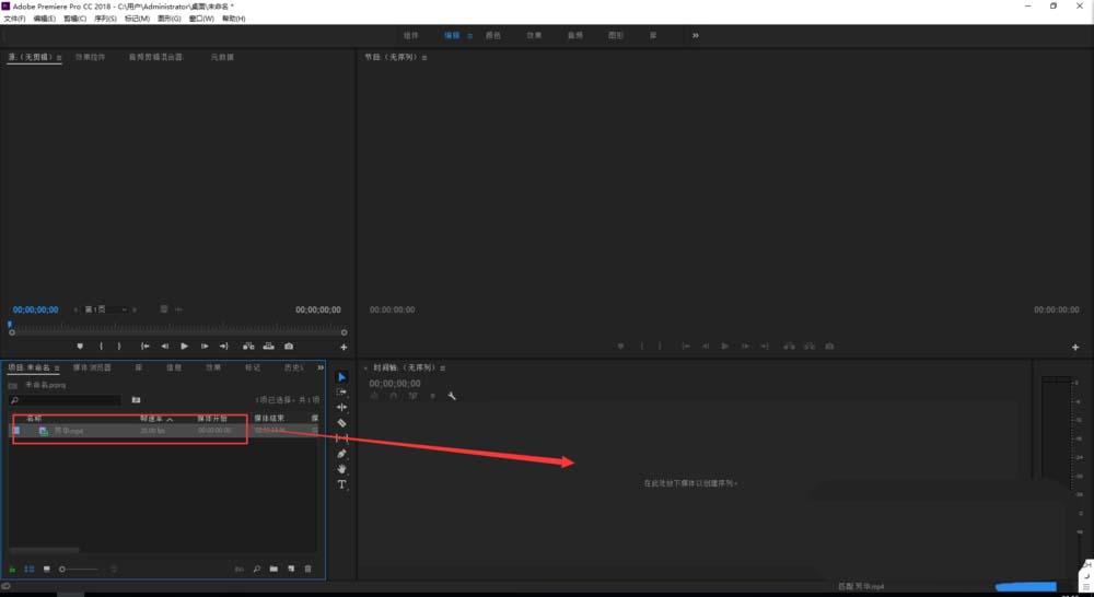4、鼠标选中导入的视频,不送手,直接把视频拖拽到时间轴模块中,就会自动新建一个序列。