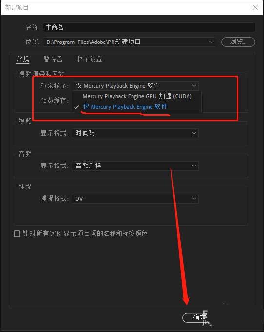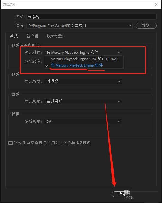 3、在新建项目的设置里面,我们在常规下面,渲染程序:修改选择第二个,仅Mercury Playback Engine软件。选择第二个渲染模式之后,我们的视频素材就不会再PR里面出现花屏了。