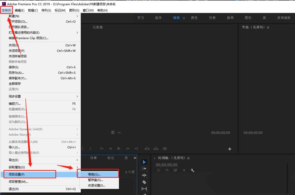 1、在创建项目之后,接下来我们进入了PR的工作界面,我们在菜单栏,文件--项目设置--常规,我们打开设置。