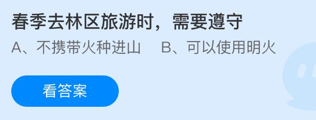春季去林区旅游时,需要遵守?支付宝小鸡课堂开课啦!每天只需花一分钟,动动手指答对问题,180g饲料立马到账!不仅自家小鸡吃得饱饱的,还能顺便捐个爱心,一举两得!2026年4月16日蚂蚁庄园的小鸡课堂题目正确答案是【不携带火种进山】,春季去林区旅游时,需要遵守不携带火种进山。