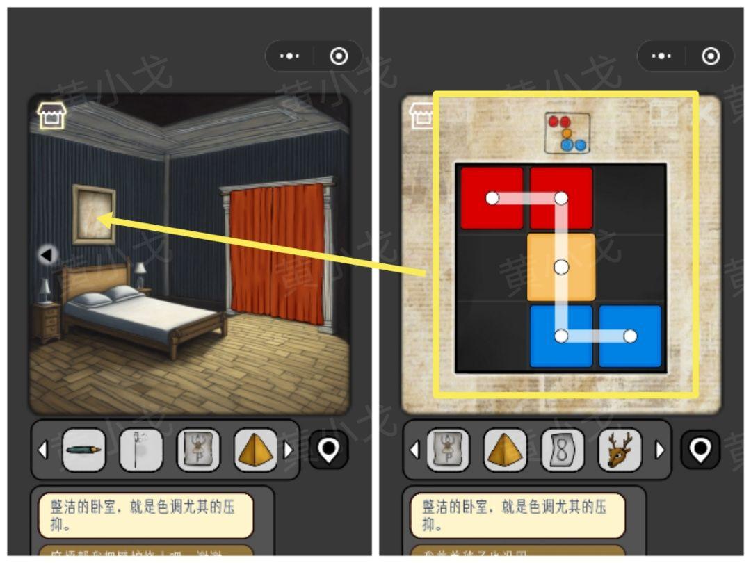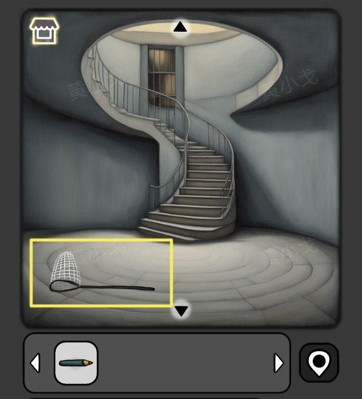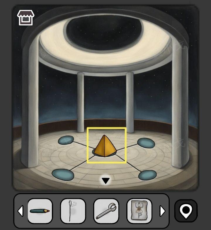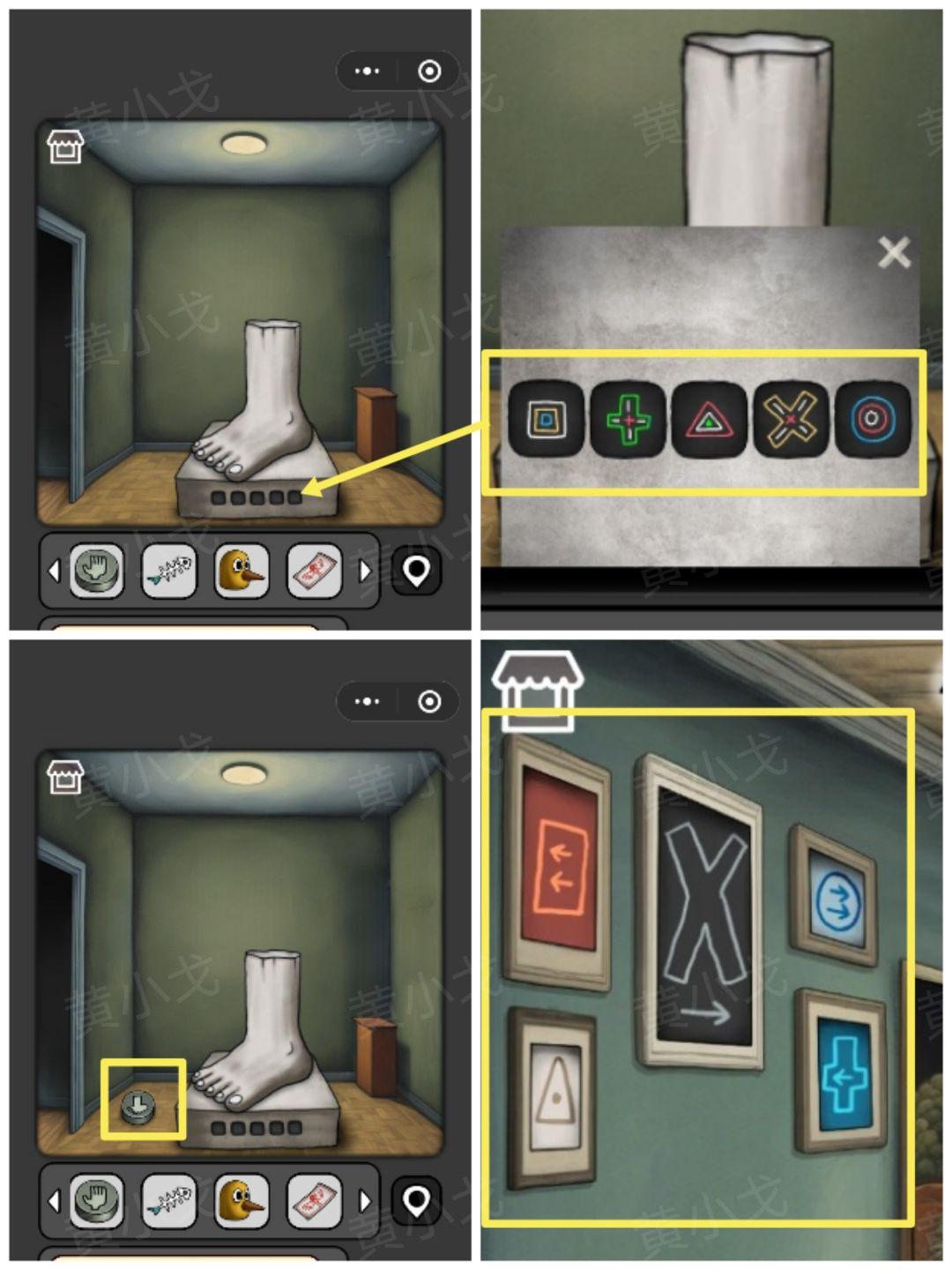 27.点击雕塑底座上的机关,根据[小屋-楼梯口]场景画框里的图案线索,调整机关,获得【按钮】
