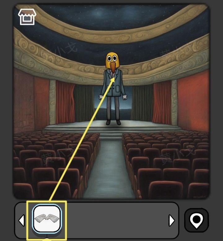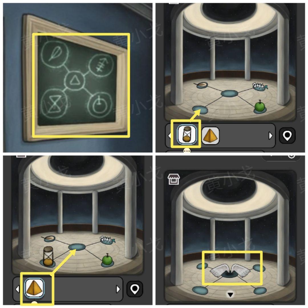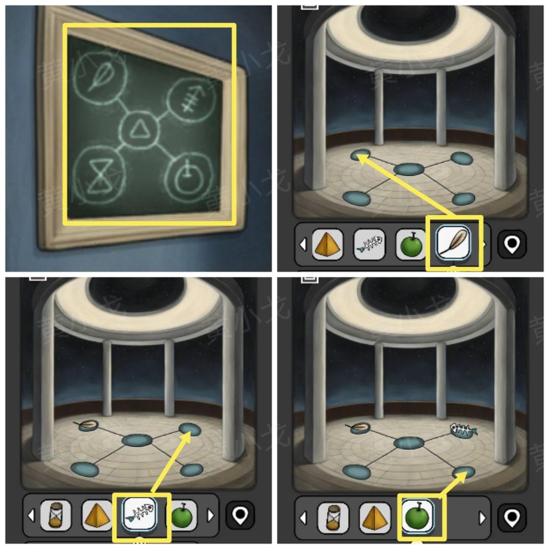 32.根据[剧院-楼梯]场景黑板上的线索,按正确的位置摆放【羽毛】、【鱼骨头】、【苹果】、【沙漏】和【金字塔】,获得【翅膀】