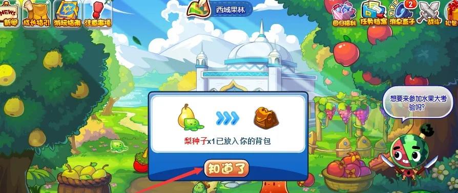 第一步,进入王国,点击“地图”;第二步,打开地图之后,点击进入“西域果林”;第三步,点击npc附近的“果实”;第四步,即可获得“梨种子”。