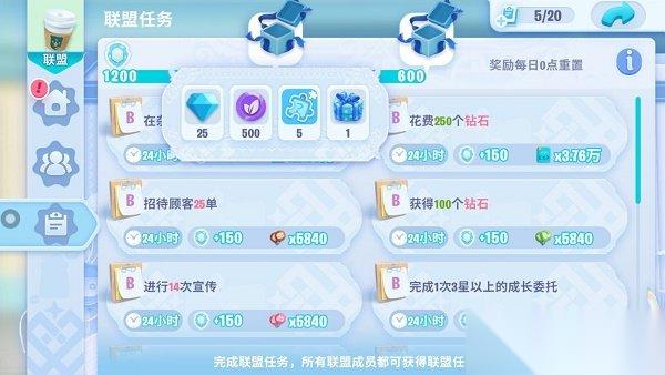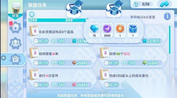 5、白嫖钻石攻略:1)小店日常任务及做满6个任务赠送的礼包加起来会送150钻;2)咖啡协会每过一个关卡都有钻石赠送;3)加入联盟后,每日联盟任务赠送的2个联盟礼包内也都有钻石;4)商城里的每日礼包,每天会赠送5个钻石。