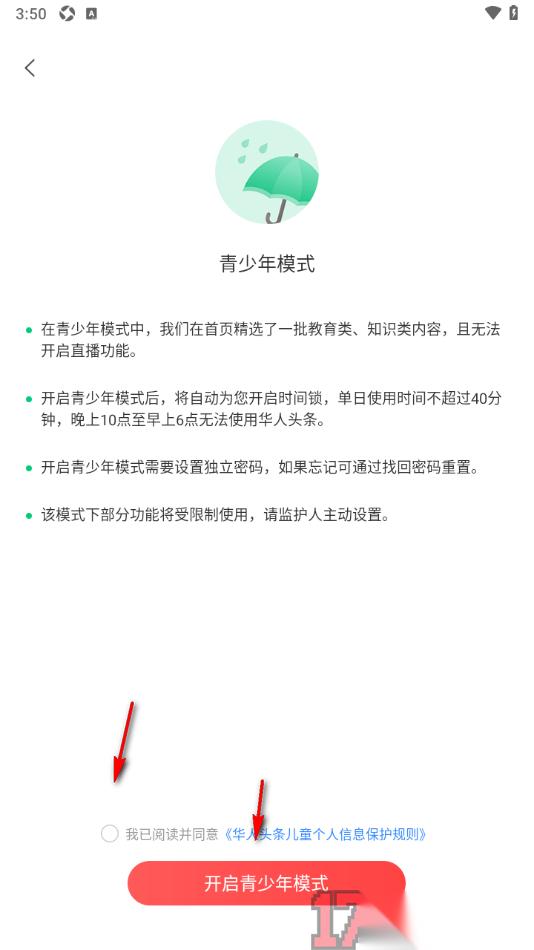4.这时候页面上即可呈现出该功能的说明信息,在底部的位置点击勾选我已阅读并同意选项,然后再点击【开启青少年模式】。