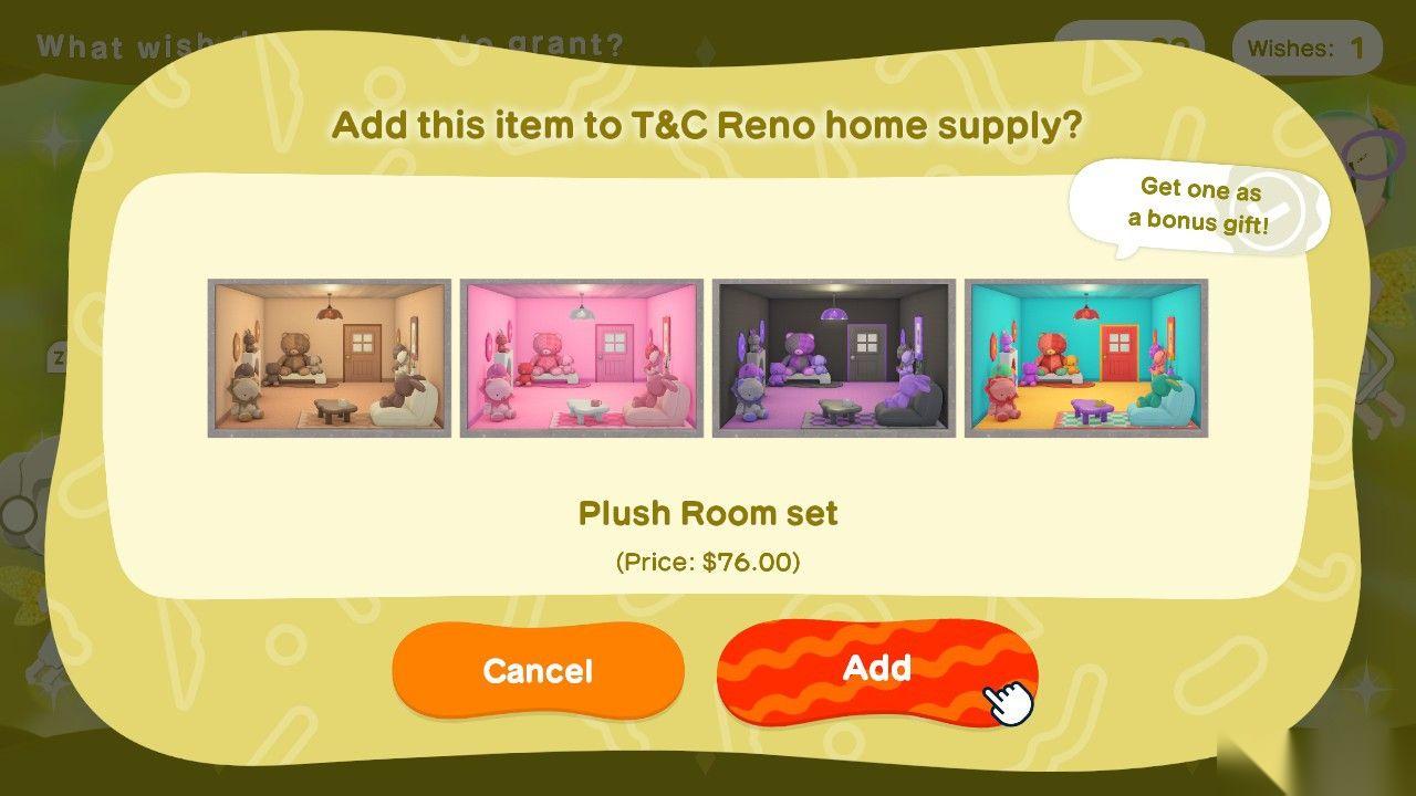 当岛上有四名 Mii 并且他们之间有两对好友时,你将解锁T&C Reno,这是一个专注于Tomodachi Life: Living The Dream室内设计的建筑。在这里,你可以获得各种图案和颜色的室内套装。这里的所有物品都需要花钱购买,一旦购买了新房间,你可以在与 Mii 交谈并选择“装修”(Renovate)选项时将其赠送给岛上的任何 Mii。