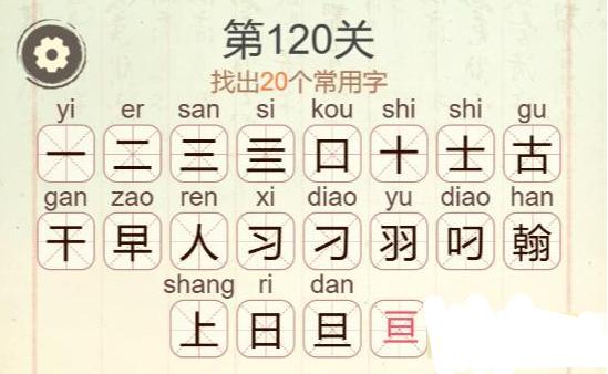微信小游戏《聪明开局吧》第120关中,大家需要在【翰】找出20个常用字,答案是一、二、三、亖、囗、十、士、古、干、早、人、习、刁、羽、叼、翰、上、日、旦、亘。结合笔画逐一识别即可通关。