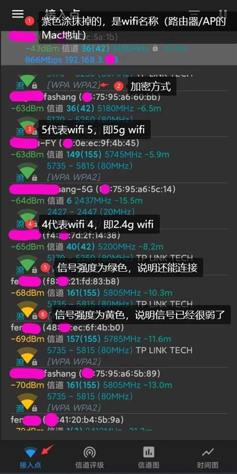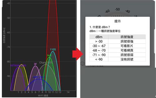 dBm值越接近0,信号越强(绿色);dBm值越远离0,信号越弱(黄色、红色)调整了路由器/AP的位置、高度、遮挡,也会相应的影响信号强度。