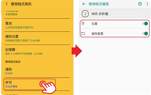 安装好Wi-Fi Analyzer,记得点开「应用程序」中的「许可」的部分给予它权限,将「位置」跟「储存装置」都打开即可。