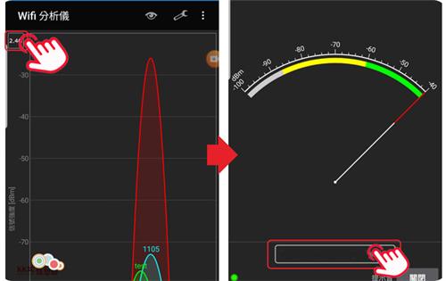 左上角有一个2.4G的选项,点一下就变5G了,就这样么简单,要测试dBM强度或是分析网络,都要记得选你现在正要测试的网络帐号喔!