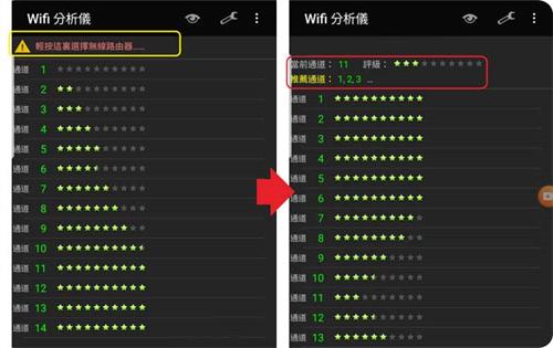 这错综复杂的网络分析图是什么意思其实不是很重要,你只要知道最高的是你的就对了!下方有1~13,就是目前网络所有的频道,哪个点被占用的最少,网络质量就是越好!