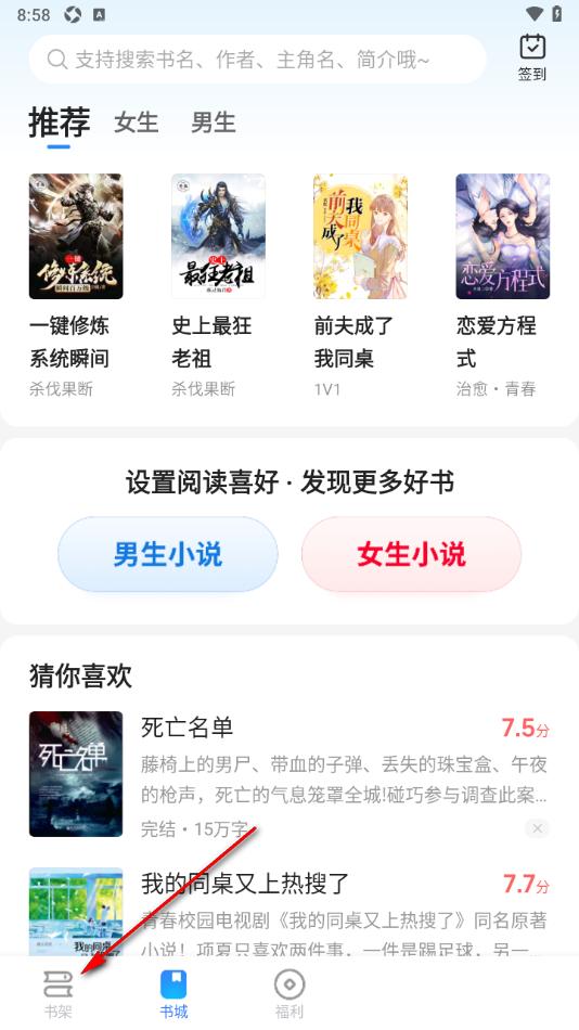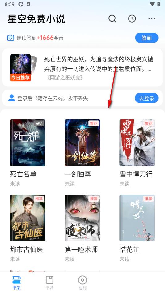 1.当我们进入到星空免费小说APP这款软件之后,在页面下方的位置选择【书架】选项,将其点击打开。